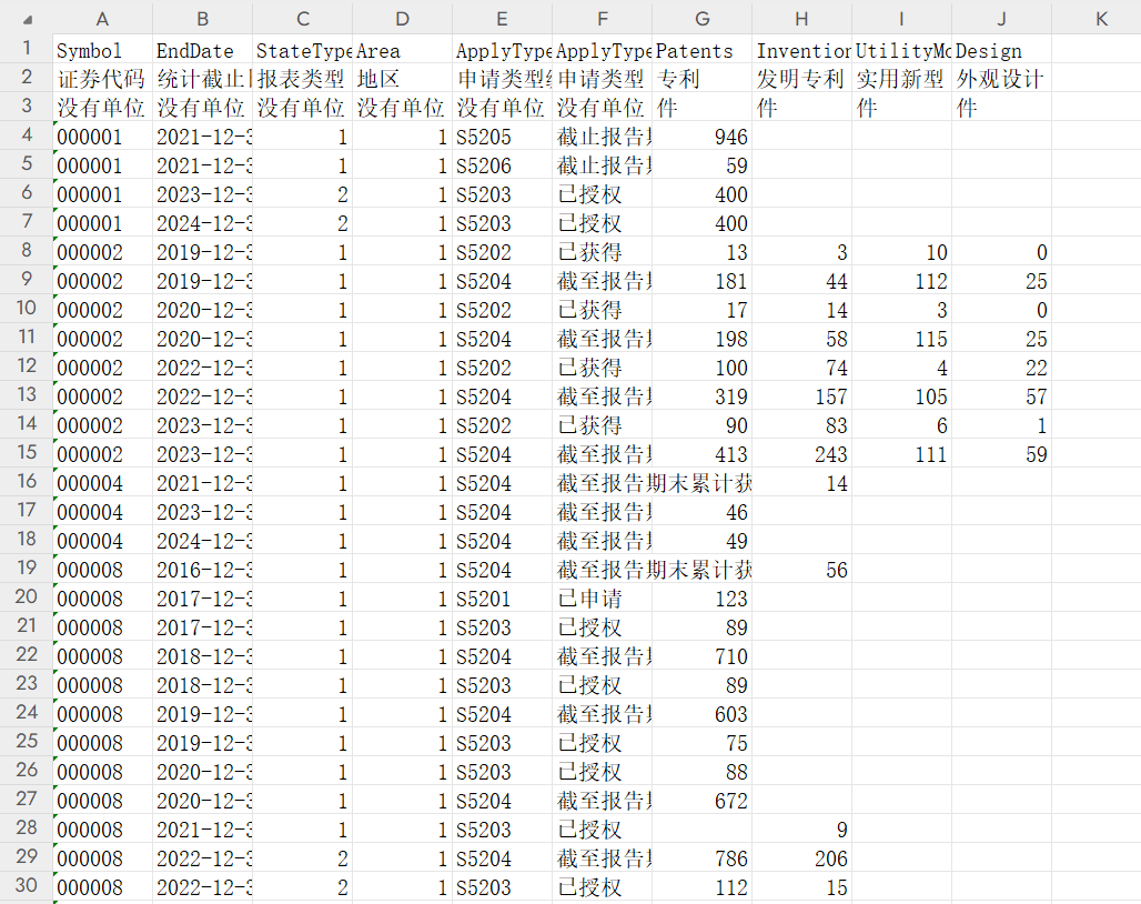 ApplyTypeCode [申请类型编码] - S5201=已申请;S5202=已获得;S5203=已授权;S5204=截至报告期末累计获得;S5205=截止报告期末累计已被受理;S5206=截止报告期末累计已授权