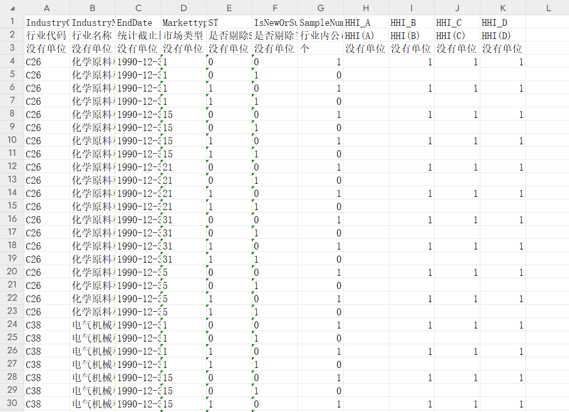 此帖数据相同,详细说明见:1990-2024年产品市场竞争赫芬达尔指数HHI,企业竞争地位勒纳指数,行业集中度CR - 经管之家