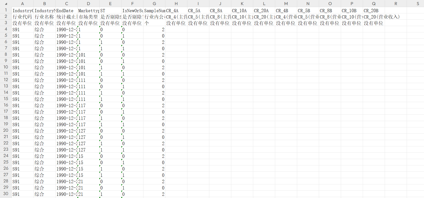 CR_4A [CR_4(主营业务收入)] - 计算公式为:CR_n=[sum(Xi)]/X,指标为计算行业内最大的前n家公司的主营业务收入占全行业主营业务收入的比例。其中,X_i为单个公司的主营业务收入,X为该公司所属行业的主营业务收入总计。其中,n分别取4,5,8,10,20代入计算(若该行业中公司数目不足,则记为NULL。)。