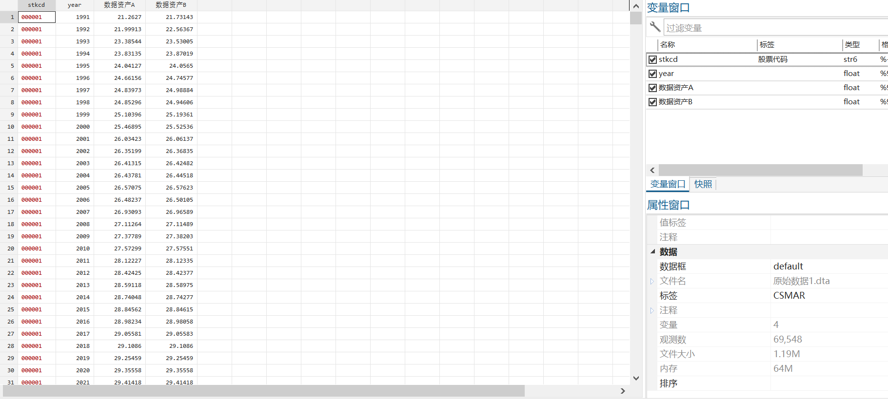 基于上文理论分析部分的公式( 9) ,构建了企业数据资产( Data_Asset) 的度量方式: Data_Asset = ln( 市场价值 - 固定资产 - 金融资产 - 无形资产) 。其中,企业的市场价值为总负债的 账面价值与股票市 值 之 和,无形资产包括金融资产和会计上的狭义无形资产。 另 外,参 照 彭 俞 超 等对金融资产范围的认定,本文将交易性金融资产、衍生金融资产、发放贷款及垫款净额、可供出 售金融资产净额、持有至到期投资净额和投资性房地产净额之和作为企业金融资产净额。