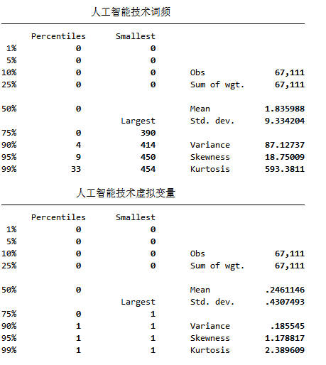 指标说明:借鉴参考做法,人工智能技术涉及的关键词包括:人工智能、商业智能、图像理解、投资决策辅助系统、智能数据分析、智能机器人、机器学习、深度学习、语义搜索、生物识别技术、人脸识别、语音识别、身份验证、自动驾驶、自然语言处理。以上述关键词为基础,对上市公司年报文本进行文本分析,生成人工智能技术词频,当公司年报中涉及上述关键词时,将人工智能技术虚拟变量取值为1,否则为0