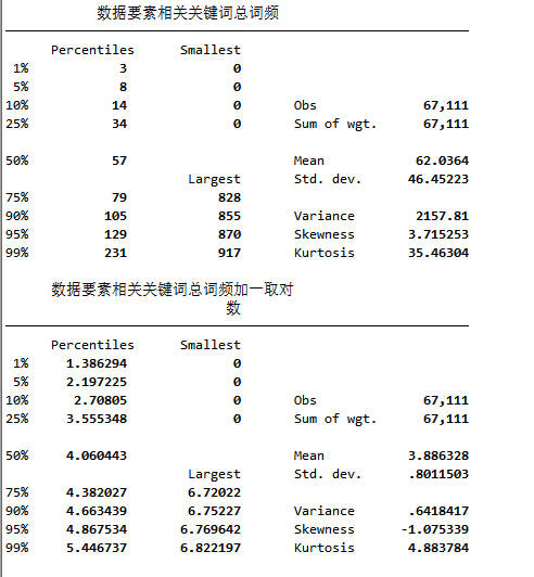 指标说明:数据要素相关关键词总词频,数据要素相关关键词:数据要素、大数据、算力、信息、数据化、算法。从上市公司年报中提取各个关键词词频,并进行加总后即为总词频。Indata为数据要素相关关键词总词频加一后取自然对数,Indata=ln(数据要素相关关键词总词频+1)。