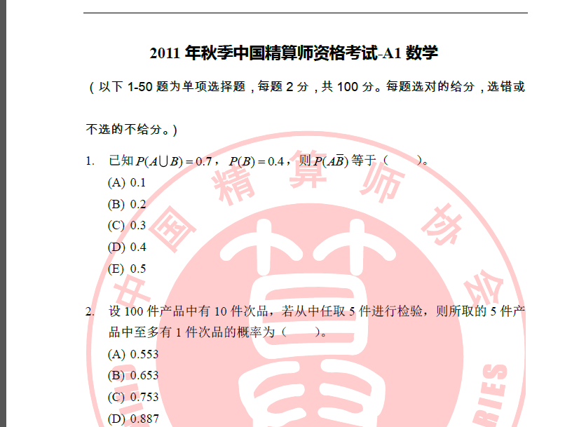 2011年秋季的精算师考试试题、每一份里面都是试题和答案