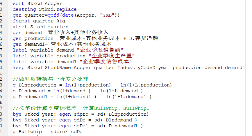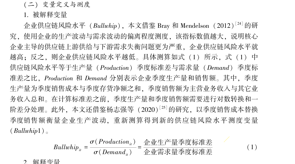 2.测算方式:参考C刊《国际贸易问题》刘啟仁(2024)老师的做法,使用企业的生产波动与需求波动的偏离程度测度, 该指标数值越大, 说明核心企业主导的供应链上游供给与下游需求失衡问题更为严重, 企业供应链风险水平就越高; 反之, 则企业供应链风险水平越低。 具体测算如式 (1) 所示, 式 (1) 中供应链风险水平等于生产量 (Production) 季度标准差与需求量 (Demand) 季度标准差之比, Production 和 Demand 分别表示企业季度生产量和销售额。 其中, 季度生产量为季度销售成本与季度存货净额之和, 季度销售额为主营业务收入与其它业务收入总和。 在计算标准差之前, 季度生产量和季度销售额需要进行对数转换和一阶差分处理。 此外, 本文还借鉴杨志强等 (2020)[25]的研究, 以季度销售成本替换季度销售额衡量企业生产波动, 重新测算得到新的供应链风险水平测度变量