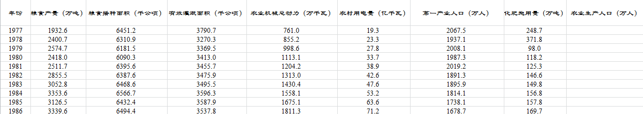粮食产量(万吨) 粮食播种面积(千公顷) 有效灌溉面积(千公顷) 农业机械总动力(万千瓦) 农村用电量(亿千瓦) 第一产业人口(万人) 化肥施用量(万吨) 农业生产人口(万人)