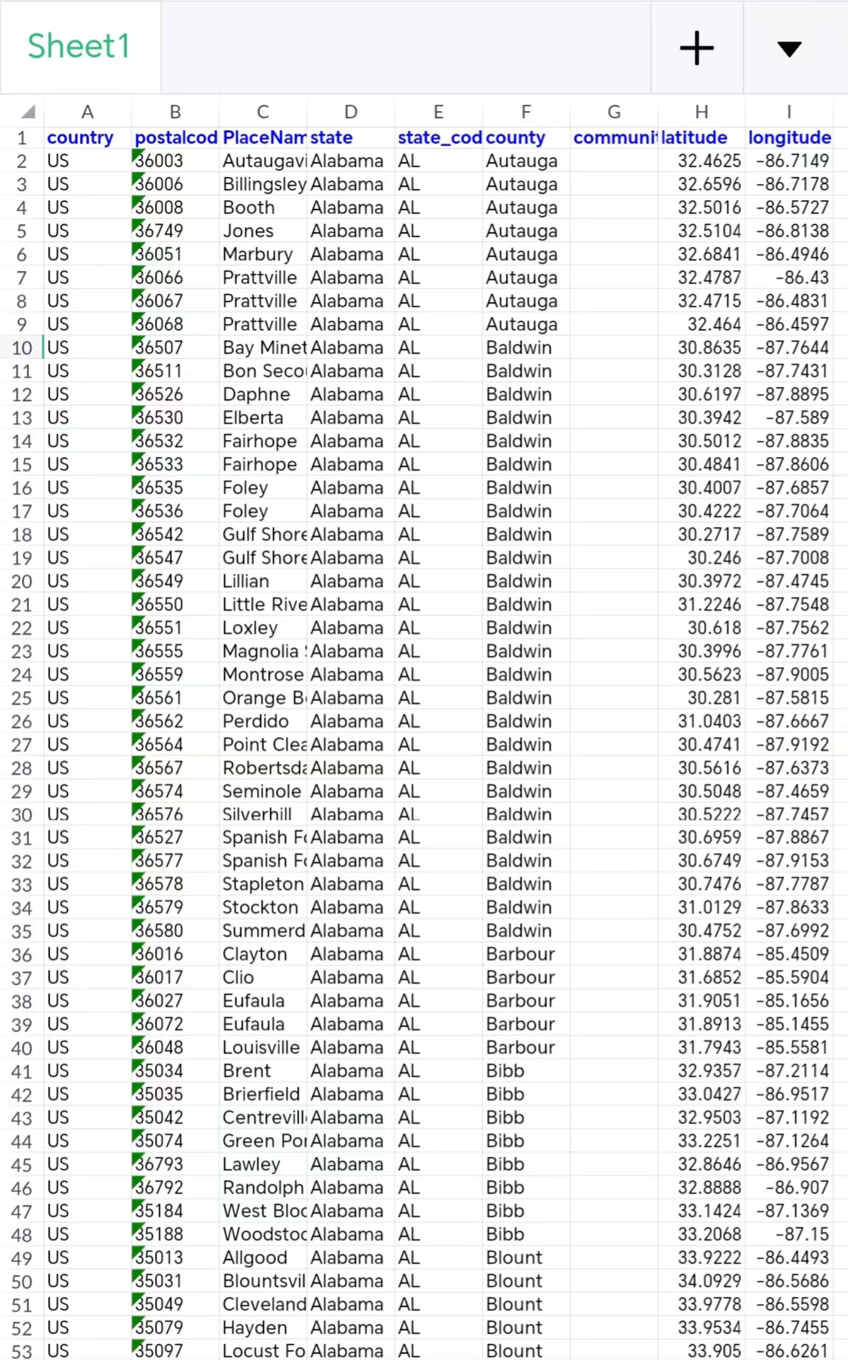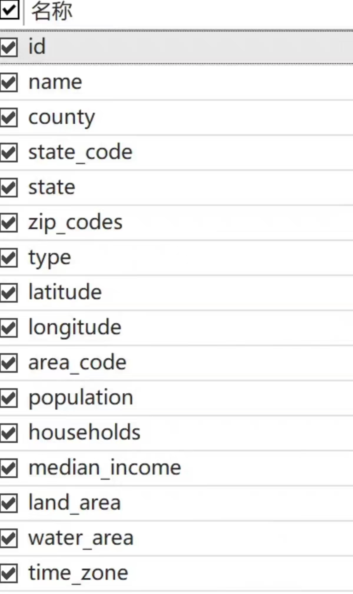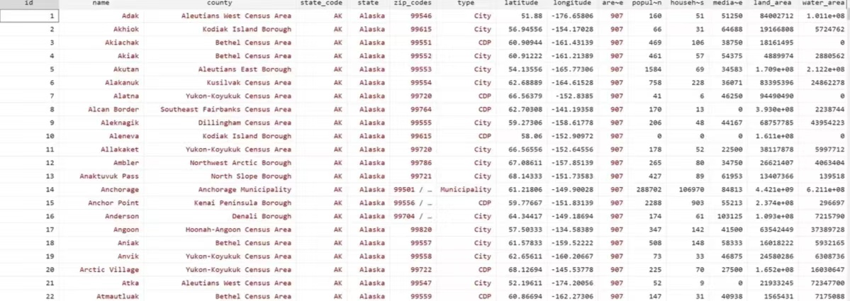 美国 城市 县 州 数据(cities-counties-states Data),包括每个城市对应的县 州 州代码 邮编 地区代码 经纬度 人口 家庭数 中位数入 土地面积 时区等信息