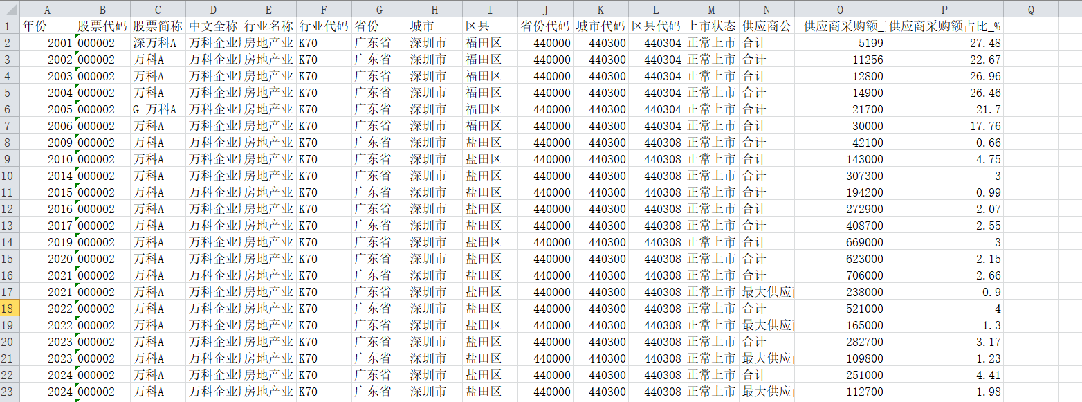 供应商采购:年份 股票代码 股票简称 中文全称 行业名称 行业代码 省份 城市 区县 省份代码 城市代码 区县代码 上市状态 供应商公司名称 供应商采购额_万元 供应商采购额占比_%