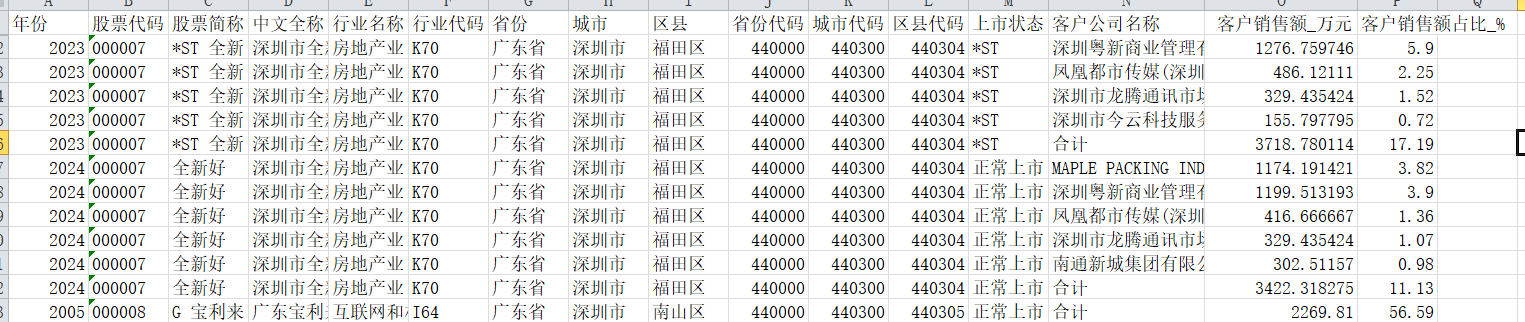 客户销售:年份 股票代码 股票简称 中文全称 行业名称 行业代码 省份 城市 区县 省份代码 城市代码 区县代码 上市状态 客户公司名称 客户销售额_万元 客户销售额占比_%