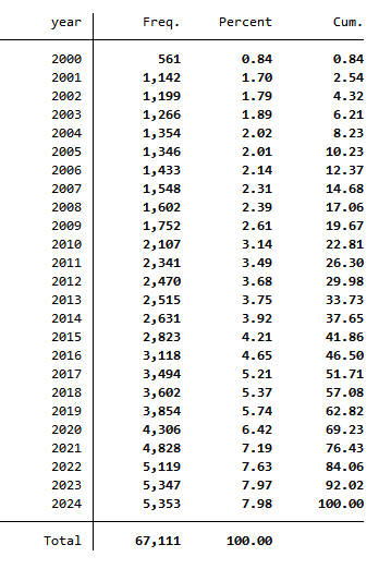 本资料所使用的词频原始数据为使用Python对上市公司年报进行文本分析后获得(jieba分词,停用词表使用哈工大停用词表),后续使用Stata进行整理,最终形成面板数据形式。
