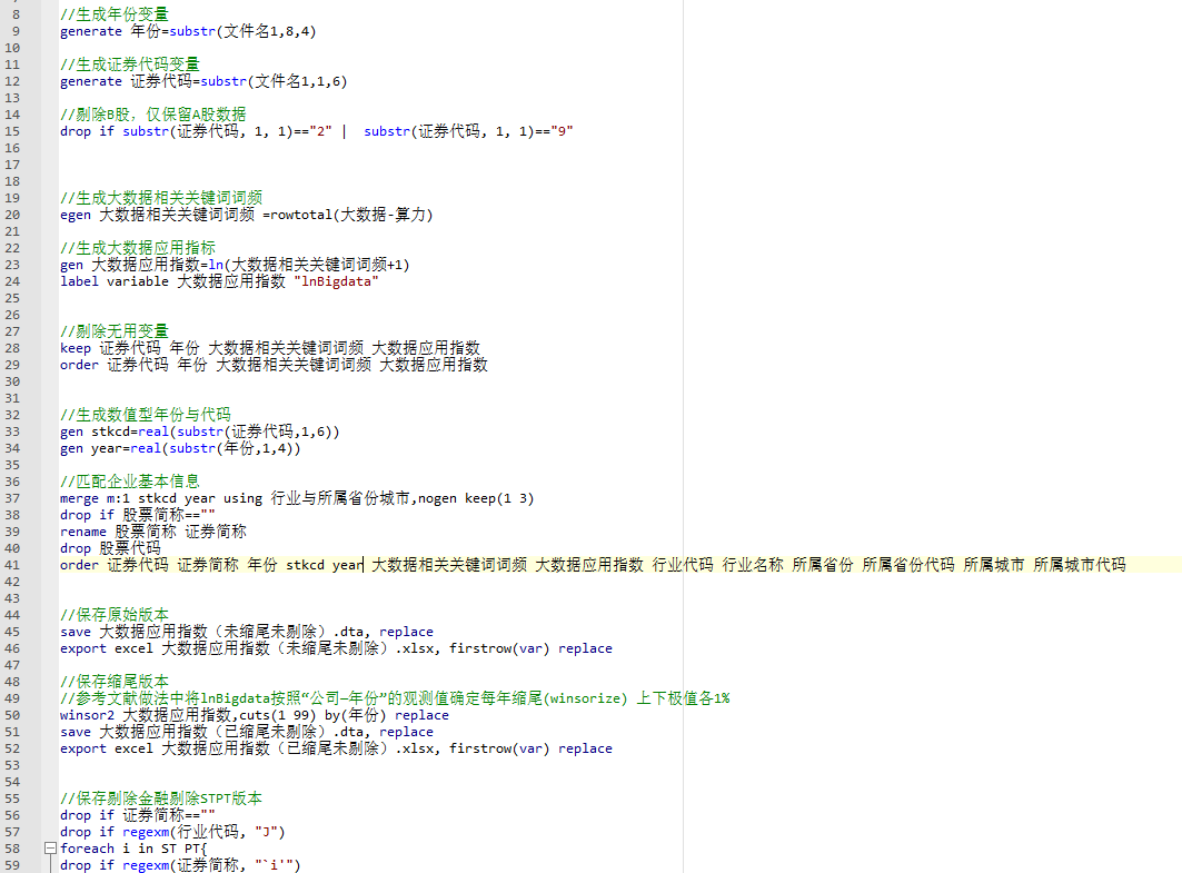 处理软件原始数据为使用Python对上市公司年报进行文本分析后获得(jieba分词,停用词表使用哈工大停用词表),后续使用Stata进行整理,最终形成面板数据形式