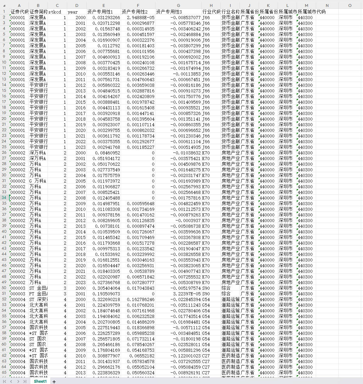 证券代码、证券简称、stkcd、year、资产专用性1、资产专用性2、资产专用性3、行业代码、行业名称、所属省份、所属省份代码、所属城市、所属城市代码