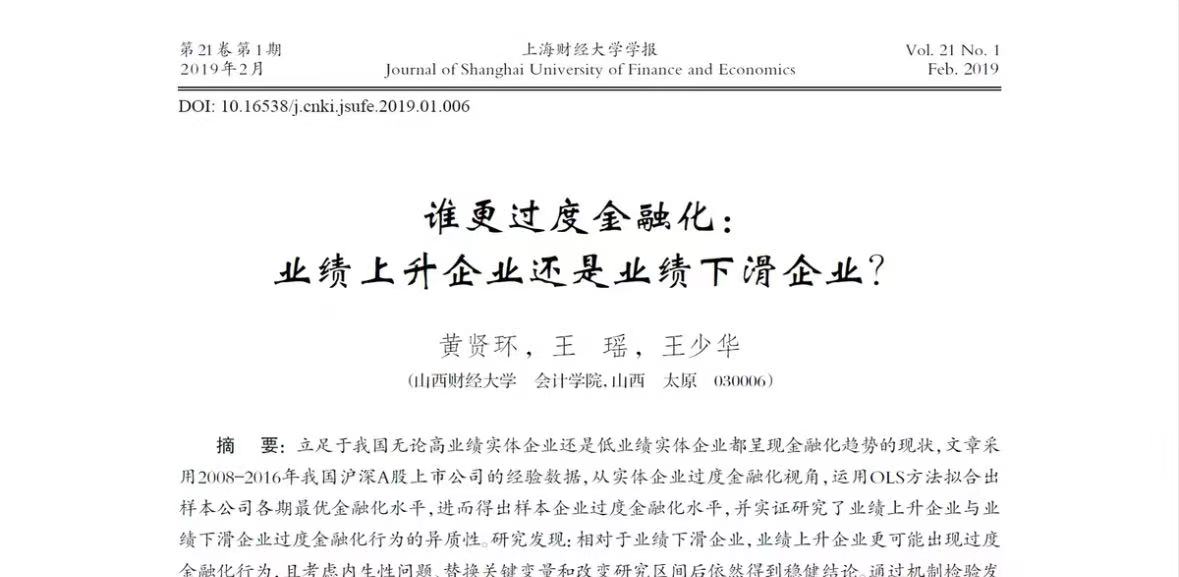 黄贤环, 王瑶, 王少华. 谁更过度金融化:业绩上升企业还是业绩下滑企业?[J]. 上海财经大学学报, 2019, 21(01):81-95+139.