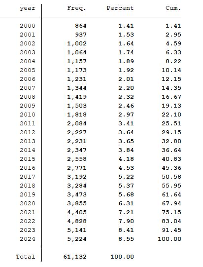 - 数据对象:沪深京A股2000-2024年数据,剔除金融行业,剔除上市之前的数据,剔除退市公司,剔除缺失值