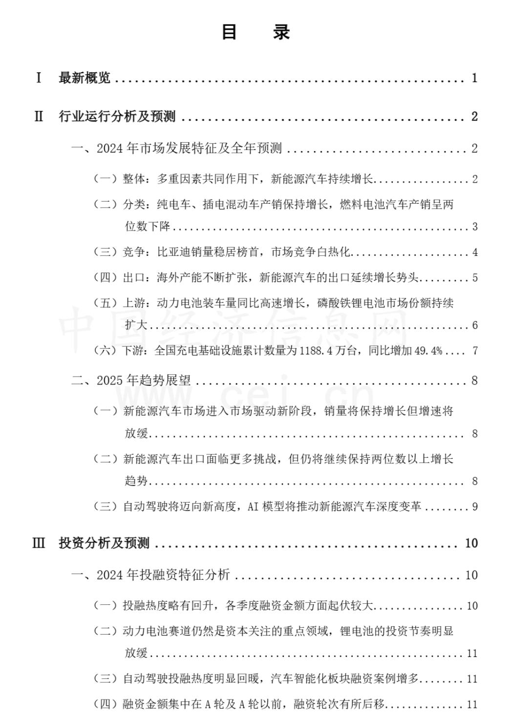 总体来看,2024年,在政策利好、供给丰富、价格降低和基础设施持续改善等多重因素共同作用下,新能源汽车持续增长,产销量突破1200万辆。分动力装置类型来看,与上年相比,燃料电池汽车产销呈两位数下降,其他两大类新能源汽车品种产销呈不同程度增长。竞争格局方面,2024年,中国新能源汽车零售销量前十厂商销量合计848.54万辆,市场份额合计77.8%。出口方面,2024年,我国新能源汽车出口增速放缓进一步放缓,我国新能源汽车出口128.4万辆,同比增长6.7%。从上游来看,2024年,得益于新能源汽车产销量的攀升,我国动力电池累计装车量548.4GWh,累计同比增长41.5%。从下游来看,随着新能源汽车保有量的增长,我国充电桩数量也日益增长,中国充电联盟最新发布数据显示,2024年,我国充电基础设施增量为422.2万台,同比上升24.7%。
