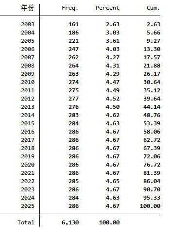 缺失情况说明:部分市早年工作报告已缺失无法搜集,缺失部分已剔除不在样本中,2003-2025年284个地级市应合计6248份原始文件,其中488份为缺失无法搜集的部分,这部分无法进行文本分析,其余5X60份均按流程进行文本分析,词频文件为“原始数据SX”、“原始数据.dta”