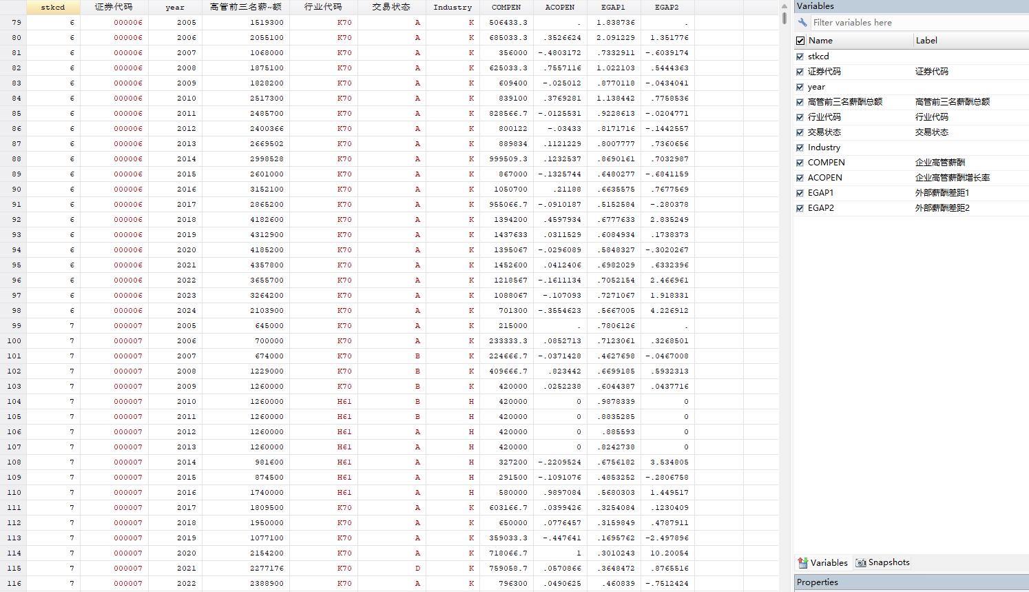 企业高管薪酬(COMPEN)= 前三名高管薪酬总额/3 企业高管薪酬增长率(ACOPEN)= (企业当期高管薪酬 - 企业上期高管薪酬)/企业上期高管薪酬 外部薪酬差距(EGAP1)= 企业高管薪酬/行业高管薪酬平均值 外部薪酬差距(EGAP2)= 企业高管薪酬增长率/行业高管薪酬的平均值增长率