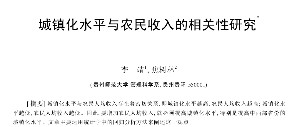 《城镇化水平与农民收入的相关性研究》——2003年2月 发表在 重庆工商大学学报(社会利学版·双月刊) 作者是贵州师范大学的李靖和焦树林。