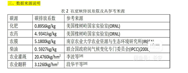 [2]计算方法:对11种能源:塑料薄膜使用量、农用柴油使用量、农药使用量、农作物播种面积、灌溉面积、化肥碳排放量、薄膜碳排放量、柴油碳排放量、农药碳排放量、翻耕碳排放量、灌溉碳排放量生产产生的二氧化碳,通过以下方法计算得出。