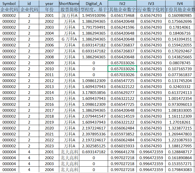 企业代码 企业代码 年份 股票简称 企业数字化转型程度。基于吴非方法构建 工具变量:同行业其他企业数字化转型程度的均值 工具变量:同行业数字化转型程度的均值 工具变量:同行业同年份其他企业数字化转型程度的均值 工具变量:同行业同年份数字化转型程度的均值 工具变量:同地区同行业同年份数字化转型程度的均值 工具变量:同地区同行业同年份其他企业数字化转型程度的均值 行业名称 制造业取两位代码,其他行业用大类