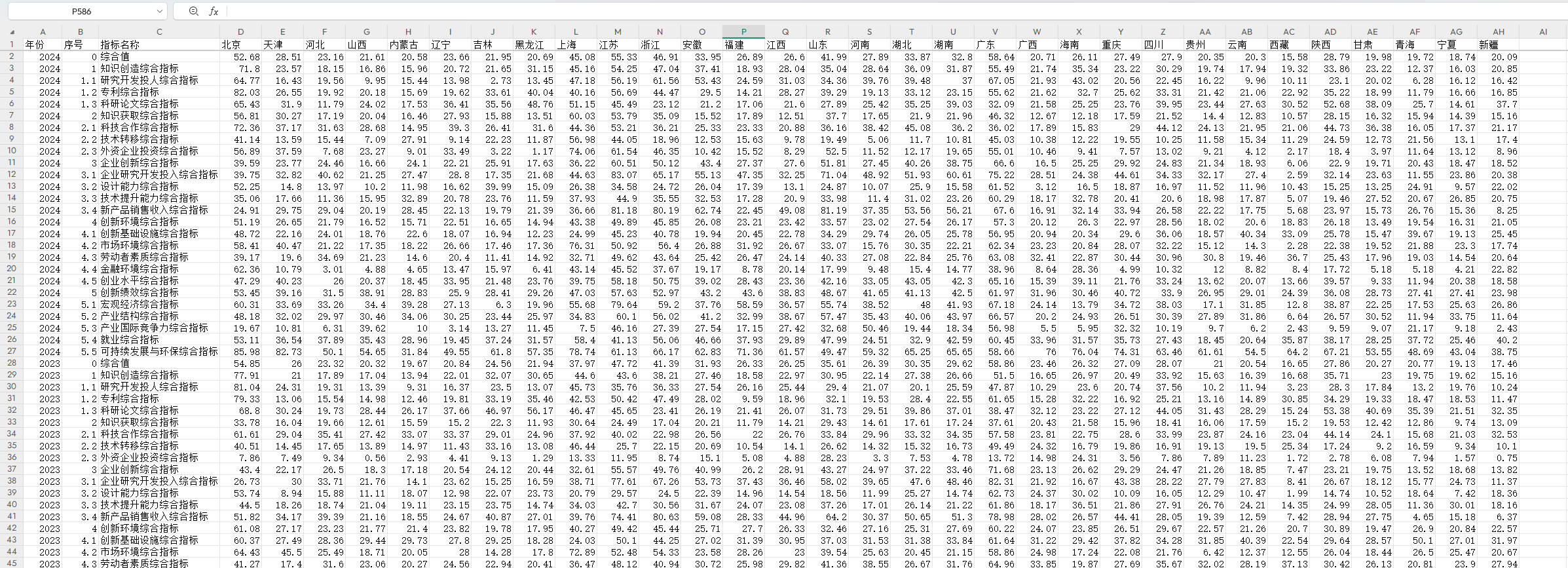 综合值、知识创造综合指标、研究开发投人综合指标、专利综合指标、科研论文综合指标、知识获取综合指标、科技合作综合指标、技术转移综合指标、外资企业投资综合指标、企业创新综合指标、企业研究开发投入综合指标、设计能力综合指标、技术提升能力综合指标、新产品销售收入综合指标、创新环境综合指标、创新基础设施综合指标、市场环境综合指标、劳动者素质综合指标、金融环境综合指标、创业水平综合指标、创新绩效综合指标、宏观经济综合指标、产业结构综合指标、产业国际竞争力综合指标、就业综合指标、可持续发展与环保综合指标