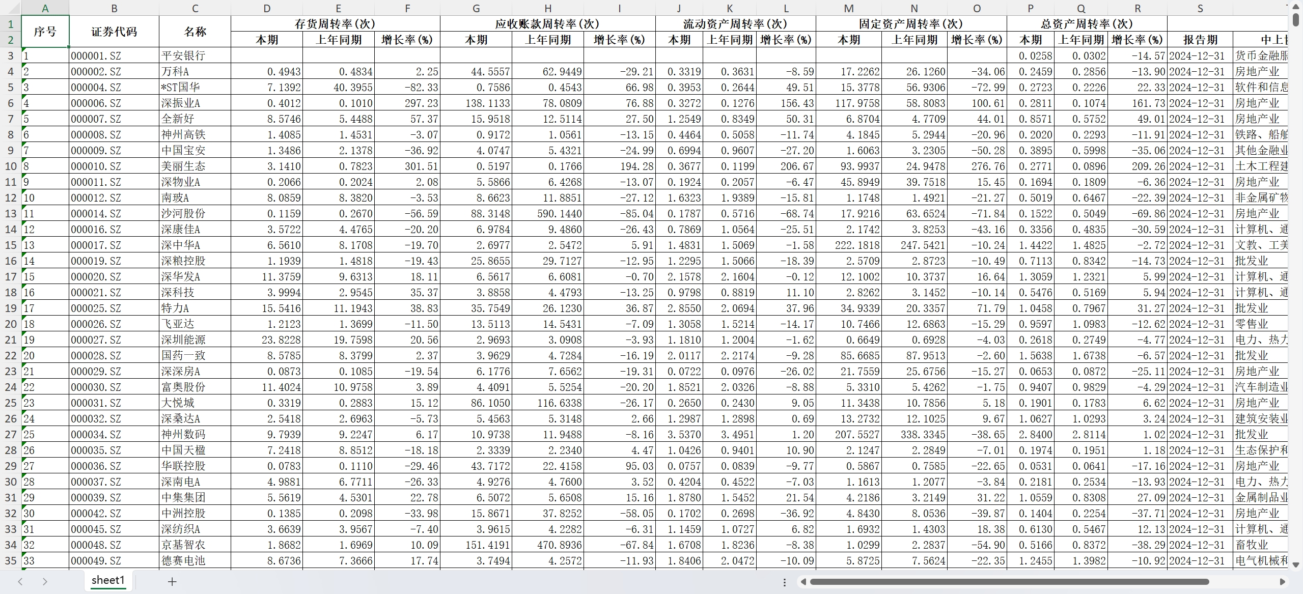 2023-2024年 5000多家上市公司 营运能力指标 存货周转率 应收账款周转率 流动资周转率产 固定资产周转率 总资产周转率 周转率