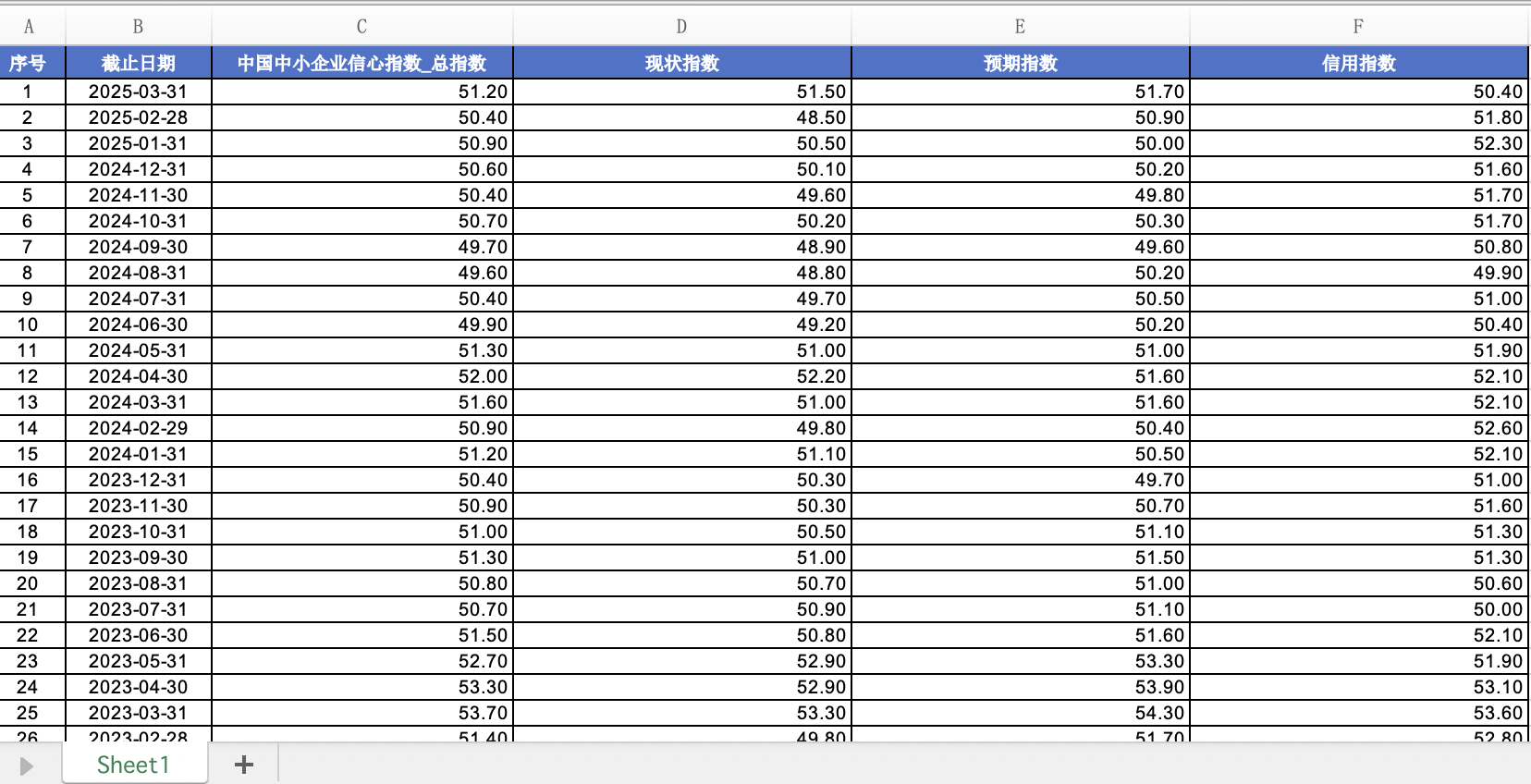 中国中小企业信心指数数据(2014.10–2025.3,月度,含现状/预期/信用指数)