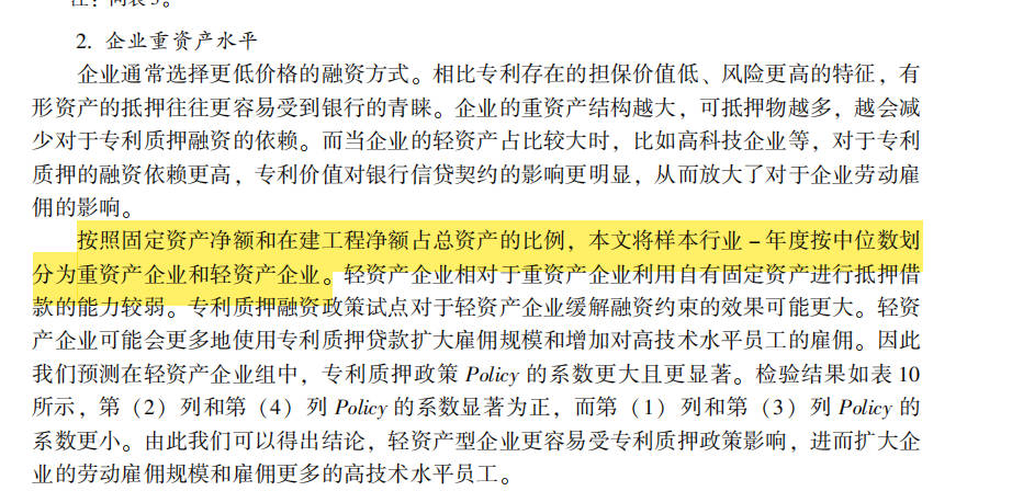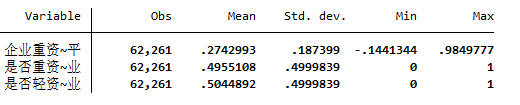 【是否重资产企业、是否轻资产企业】如果企业重资产水平高于其年度行业中位数,则是否重资产企业变量取值为1,否则取值为0。如果企业重资产水平低于其年度行业中位数,则是否轻资产企业变量取值为1,否则取值为0。