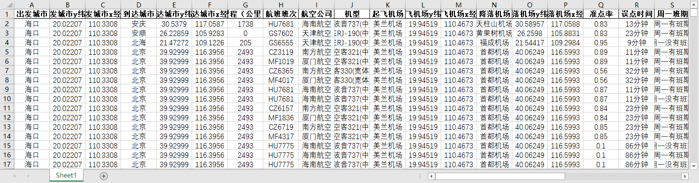 出发城市 出发城市y纬度 出发城市x经度 到达城市 到达城市y纬度 到达城市x经度 里程(公里) 航班班次 航空公司 机型 起飞机场 起飞机场y纬度 起飞机场x经度 降落机场 降落机场y纬度 降落机场x经度 准点率 误点时间 周一班期 周二班期 周三班期 周四班期 周五班期 周六班期 周日班期 城市_x 出发省份 城市_y 到达省份 起飞时间 降落时间 日期 价格(元) 人数