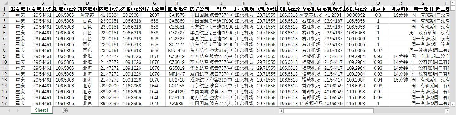 出发城市 出发城市y纬度 出发城市x经度 到达城市 到达城市y纬度 到达城市x经度 里程(公里) 航班班次 航空公司 机型 起飞机场 起飞机场y纬度 起飞机场x经度 降落机场 降落机场y纬度 降落机场x经度 准点率 误点时间 周一班期 周二班期 周三班期 周四班期 周五班期 周六班期 周日班期 城市_x 出发省份 城市_y 到达省份 起飞时间 降落时间 日期 价格(元) 人数