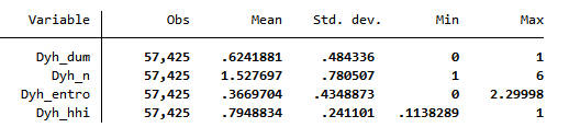 【3】收入熵指数Dyh_entro.收入熵指数=∑piIn(1/pi),pi为第i个行业在总收入中的比重,本指数越大,多元化程度越高人