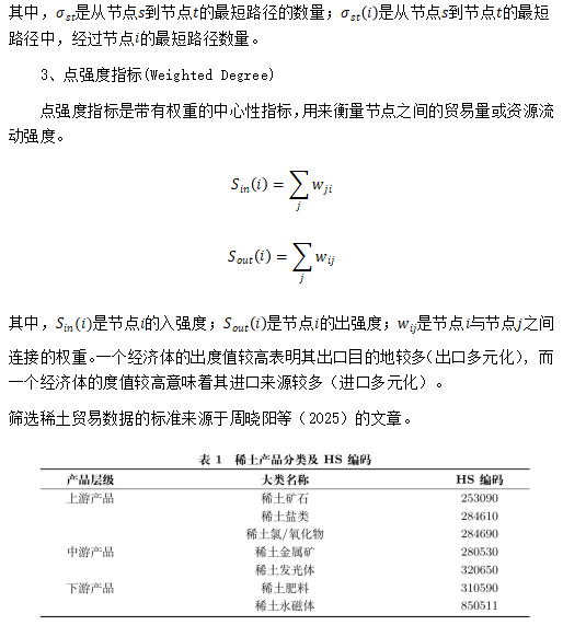 数据简介受美国贸易保护主义的影响,全球稀土贸易格局发生了剧烈的变化,因此本团队收集了从2018年第一次中美关税战开始的稀土贸易数据并构建贸易网络,通过三个网络指标(度中心性、介数中心性、点强度)共同揭示了各个国家或地区(下面简称国家)在全球战略性矿产贸易网络中的结构性地位与影响力。度中心性衡量节点(国家)的直接连接数量,反映贸易关系的广度。入度表示进口来源国的数量,体现供应渠道的多元化程度;出度表示出口目的国的数量,体现市场覆盖范围。介数中心性表征节点控制资源流转的能力。数值越高,说明该国在贸易路径中担任“枢纽”角色,对资源流动的掌控力越强。点强度结合贸易权重(如进出口额),量化实际贸易规模。入强度体现资源进口依赖度(如中国钴上游进口额高);出强度反映出口主导力(如刚果(金)钴上游出口额领先)。该指标揭示贸易量级差异,比单纯连接数更精准刻画节点影响力。本团队参考周晓阳、徐衍爽、李泽煜、吴迪、汪寿阳(2025)的文章,按照如下步骤得出三种稀土网络指标: