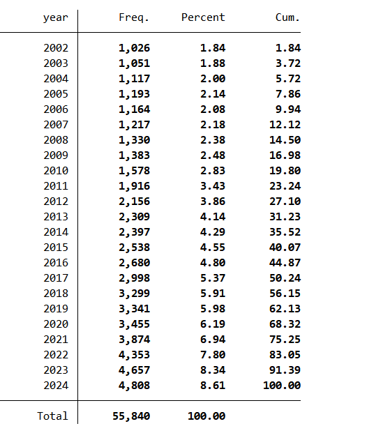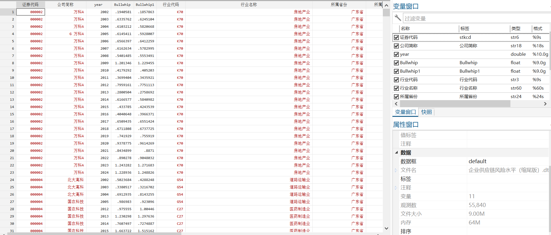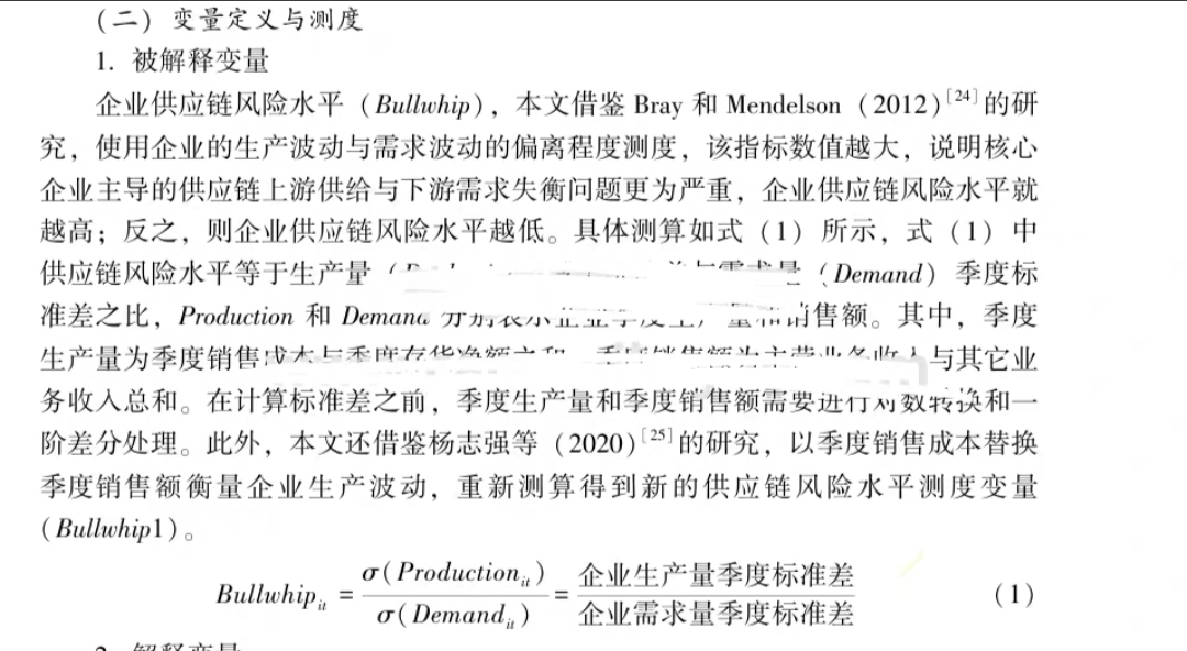 测算方式:参考C刊《国际贸易问题》刘啟仁(2024)老师的做法,使用企业的生产波动与需求波动的偏离程度测度, 该指标数值越大, 说明核心企业主导的供应链上游供给与下游需求失衡问题更为严重, 企业供应链风险水平就越高; 反之, 则企业供应链风险水平越低。 具体测算如式 (1) 所示, 式 (1) 中供应链风险水平等于生产量 (Production) 季度标准差与需求量 (Demand) 季度标准差之比, Production 和 Demand 分别表示企业季度生产量和销售额。 其中, 季度生产量为季度销售成本与季度存货净额之和, 季度销售额为主营业务收入与其它业务收入总和。 在计算标准差之前, 季度生产量和季度销售额需要进行对数转换和一阶差分处理。 此外, 本文还借鉴杨志强等 (2020)[25]的研究, 以季度销售成本替换季度销售额衡量企业生产波动, 重新测算得到新的供应链风险水平测度变量