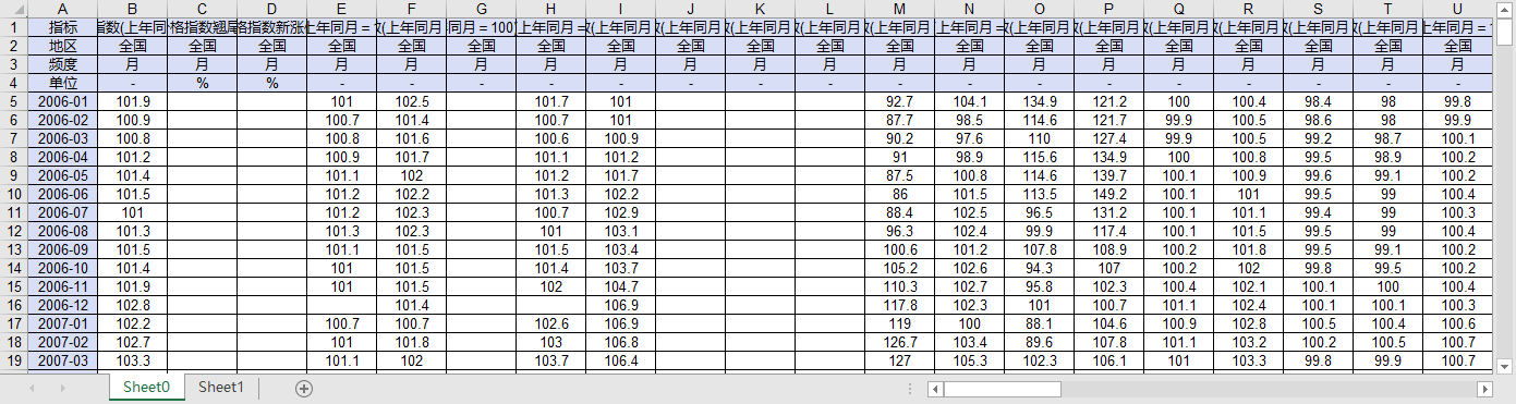 指标 居民消费价格指数(上年同月=100)_当期 居民消费价格指数翘尾因素_当期 居民消费价格指数新涨价因素_当期 居民消费价格指数(上年同月=100)_扣除食品_当期 居民消费价格指数(上年同月=100)_服务_当期 居民消费价格指数(上年同月=100)_扣除食品和能源_当期 居民消费价格指数(上年同月=100)_消费品_当期 居民消费价格指数(上年同月=100)_粮食_当期 居民消费价格指数(上年同月=100)_猪肉_当期 居民消费价格指数(上年同月=100)_牛肉_当期 居民消费价格指数(上年同月=100)_羊肉_当期 居民消费价格指数(上年同月=100)_蛋类_当期 居民消费价格指数(上年同月=100)_水产品_当期 居民消费价格指数(上年同月=100)_鲜菜_当期 居民消费价格指数(上年同月=100)_鲜果_当期 居民消费价格指数(上年同月=100)_卷烟_当期 居民消费价格指数(上年同月=100)_酒类_当期 居民消费价格指数(上年同月=100)_衣着_当期 居民消费价格指数(上年同月=100)_服装_当期 居民消费价格指数(上年同月=100)_医疗保健_当期 居民消费价格指数(上年同月=100)_西药_当期 居民消费价格指数(上年同月=100)_交通通信_当期 居民消费价格指数(上年同月=100)_交通工具_当期 居民消费价格指数(上年同月=100)_通信工具_当期 居民消费价格指数(上年同月=100)_通信服务_当期 居民消费价格指数(上年同月=100)_旅游_当期 居民消费价格指数(上年同月=100)_居住_当期 居民消费价格指数(上年同月=100)_租赁房房租_当期 居民消费价格指数(上年同月=100)_水、电、燃料_当期 居民消费价格指数(上年同月=100)_交通工具使用和维修_当期 居民消费价格指数(上年同月=100)_畜肉类_当期 居民消费价格指数(上年同月=100)_家庭服务_当期 居民消费价格指数(上年同月=100)_家用器具_当期 居民消费价格指数(上年同月=100)_交通工具用燃料_当期 居民消费价格指数(上年同月=100)_教育服务_当期 居民消费价格指数(上年同月=100)_教育文化娱乐_当期 居民消费价格指数(上年同月=100)_扣除鲜菜鲜果_当期 居民消费价格指数(上年同月=100)_奶类_当期 居民消费价格指数(上年同月=100)_其他用品及服务_当期 居民消费价格指数(上年同月=100)_生活用品及服务_当期 居民消费价格指数(上年同月=100)_食品_当期 居民消费价格指数(上年同月=100)_食品烟酒_当期 居民消费价格指数(上年同月=100)_食用油_当期 居民消费价格指数(上年同月=100)_鞋类_当期 居民消费价格指数(上年同月=100)_衣着加工服务费_当期 居民消费价格指数(上年同月=100)_医疗服务_当期 居民消费价格指数(上年同月=100)_邮递服务_当期 居民消费价格指数(上年同月=100)_中药_当期 居民消费价格指数(上年同期=100)_累计 居民消费价格指数(上年同期=100)_扣除食品_累计 居民消费价格指数(上年同期=100)_服务_累计 居民消费价格指数(上年同期=100)_扣除食品和能源_累计 居民消费价格指数(上年同期=100)_消费品_累计 居民消费价格指数(上年同期=100)_粮食_累计 居民消费价格指数(上年同期=100)_猪肉_累计 居民消费价格指数(上年同期=100)_牛肉_累计 居民消费价格指数(上年同期=100)_羊肉_累计 居民消费价格指数(上年同期=100)_蛋类_累计 居民消费价格指数(上年同期=100)_水产品_累计 居民消费价格指数(上年同期=100)_鲜菜_累计 居民消费价格指数(上年同期=100)_鲜果_累计 居民消费价格指数(上年同期=100)_卷烟_累计 居民消费价格指数(上年同期=100)_酒类_累计 居民消费价格指数(上年同期=100)_衣着_累计 居民消费价格指数(上年同期=100)_服装_累计 居民消费价格指数(上年同期=100)_医疗保健_累计 居民消费价格指数(上年同期=100)_西药_累计 居民消费价格指数(上年同期=100)_交通通信_累计 居民消费价格指数(上年同期=100)_交通工具_累计 居民消费价格指数(上年同期=100)_通信工具_累计 居民消费价格指数(上年同期=100)_通信服务_累计 居民消费价格指数(上年同期=100)_旅游_累计 居民消费价格指数(上年同期=100)_居住_累计 居民消费价格指数(上年同期=100)_租赁房房租_累计 居民消费价格指数(上年同期=100)_水、电、燃料_累计 居民消费价格指数(上年同期=100)_交通工具使用和维修_累计 居民消费价格指数(上年同期=100)_畜肉类_累计 居民消费价格指数(上年同期=100)_家庭服务_累计 居民消费价格指数(上年同期=100)_家用器具_累计 居民消费价格指数(上年同期=100)_交通工具用燃料_累计 居民消费价格指数(上年同期=100)_教育服务_累计 居民消费价格指数(上年同期=100)_教育文化娱乐_累计 居民消费价格指数(上年同期=100)_扣除鲜菜鲜果_累计 居民消费价格指数(上年同期=100)_奶类_累计 居民消费价格指数(上年同期=100)_其他用品及服务_累计 居民消费价格指数(上年同期=100)_生活用品及服务_累计 居民消费价格指数(上年同期=100)_食品_累计 居民消费价格指数(上年同期=100)_食品烟酒_累计 居民消费价格指数(上年同期=100)_食用油_累计 居民消费价格指数(上年同期=100)_鞋类_累计 居民消费价格指数(上年同期=100)_衣着加工服务费_累计 居民消费价格指数(上年同期=100)_医疗服务_累计 居民消费价格指数(上年同期=100)_邮递服务_累计 居民消费价格指数(上年同期=100)_中药_累计