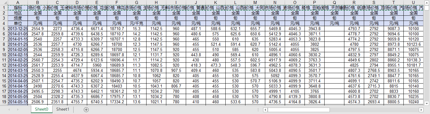 指标 流通领域生产资料市场价格_小麦(国标三等)_旬平均 流通领域生产资料市场价格_玉米(黄玉米二等)_旬平均 流通领域生产资料市场价格_大豆_旬平均 流通领域生产资料市场价格_花生(油料花生米)_旬平均 流通领域生产资料市场价格_棉花(皮棉,白棉三级)_旬平均 流通领域生产资料市场价格_生猪(外三元)_旬平均 流通领域生产资料市场价格_无烟煤(洗中块)_旬平均 流通领域生产资料市场价格_主焦煤_旬平均 流通领域生产资料市场价格_普通混煤(4500大卡)_旬平均 流通领域生产资料市场价格_山西大混(5000大卡)_旬平均 流通领域生产资料市场价格_山西优混(5500大卡)_旬平均 流通领域生产资料市场价格_大同混煤(5800大卡)_旬平均 流通领域生产资料市场价格_液化天然气_旬平均 流通领域生产资料市场价格_稻米(粳稻米)_旬平均 流通领域生产资料市场价格_豆粕(粗蛋白含量≥43%)_旬平均 流通领域生产资料市场价格_天然橡胶(标胶,SCRWF)_旬平均 流通领域生产资料市场价格_纸浆(漂白化学浆)_旬平均 流通领域生产资料市场价格_瓦楞纸(高强)_旬平均 流通领域生产资料市场价格_汽油(92#国VI)_旬平均 流通领域生产资料市场价格_汽油(95#国VI)_旬平均 流通领域生产资料市场价格_柴油(0#国VI)_旬平均 流通领域生产资料市场价格_石油液化气_旬平均 流通领域生产资料市场价格_石蜡(58#半)_旬平均 流通领域生产资料市场价格_焦炭(二级冶金焦)_旬平均 流通领域生产资料市场价格_硫酸(98%)_旬平均 流通领域生产资料市场价格_烧碱(液碱,32%)_旬平均 流通领域生产资料市场价格_纯苯(石油苯,工业级)_旬平均 流通领域生产资料市场价格_苯乙烯(一级品)_旬平均 流通领域生产资料市场价格_甲醇(优等品)_旬平均 流通领域生产资料市场价格_尿素(中小颗粒)_旬平均 流通领域生产资料市场价格_复合肥(硫酸钾复合肥,氮磷钾含量45%)_旬平均 流通领域生产资料市场价格_农药(草甘膦,95%原药)_旬平均 流通领域生产资料市场价格_LLDPE(7042)_旬平均 流通领域生产资料市场价格_聚丙烯(T30S)_旬平均 流通领域生产资料市场价格_聚氯乙烯(SG5)_旬平均 流通领域生产资料市场价格_顺丁胶(BR9000)_旬平均 流通领域生产资料市场价格_涤纶长丝(FDY150D/96F)_旬平均 流通领域生产资料市场价格_普通硅酸盐水泥(P.O 42.5袋装)_旬平均 流通领域生产资料市场价格_普通硅酸盐水泥(P.O 42.5散装)_旬平均 流通领域生产资料市场价格_浮法平板玻璃(4.8/5mm)_旬平均 流通领域生产资料市场价格_螺纹钢(Φ16-25mm,HRB400)_旬平均 流通领域生产资料市场价格_线材(Φ6.5mm,HPB300)_旬平均 流通领域生产资料市场价格_普通中板(20mm,Q235)_旬平均 流通领域生产资料市场价格_热轧普通薄板(3mm,Q235)_旬平均 流通领域生产资料市场价格_无缝钢管(219*6,20#)_旬平均 流通领域生产资料市场价格_角钢(5#)_旬平均 流通领域生产资料市场价格_电解铜(1#)_旬平均 流通领域生产资料市场价格_铅锭(1#)_旬平均 流通领域生产资料市场价格_锌锭(0#)_旬平均 流通领域生产资料市场价格_铝锭(A00)_旬平均