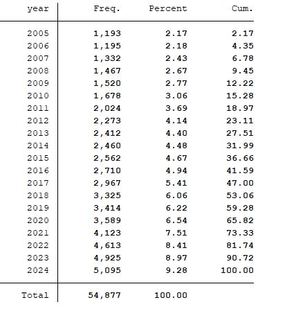 * 假设数据已导入到Stata且变量名与上述说明一致
