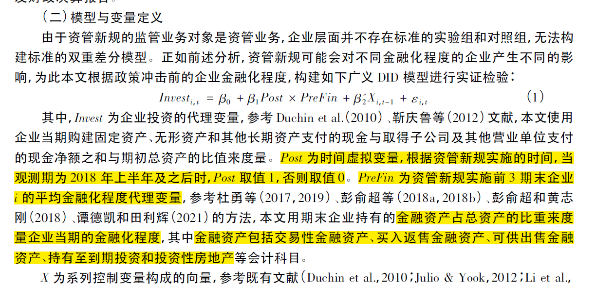 2.测算方式:参考顶刊《经济研究》李青原(2022)老师的做法,Post 为时间虚拟变量,根据资管新规实施的时间,当观测期为2018 年上半年及之后时,Post 取值1,否则取值0。PreFin 为资管新规实施前3 期末企业i 的平均金融化程度代理变量,参考杜勇等( 2017, 2019) 、彭俞超等( 2018a, 2018b) 、彭俞超和黄志