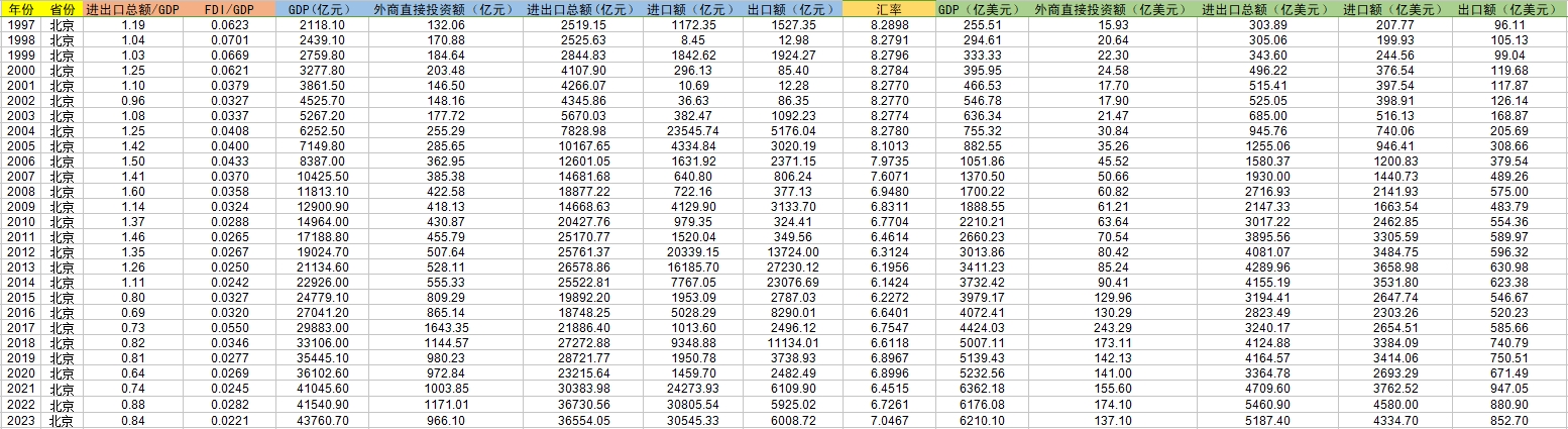 所含变量名称:对外开放指数1,对外开放指数2,外商直接投资总额,进出口总额,进口额,出口额,GDP