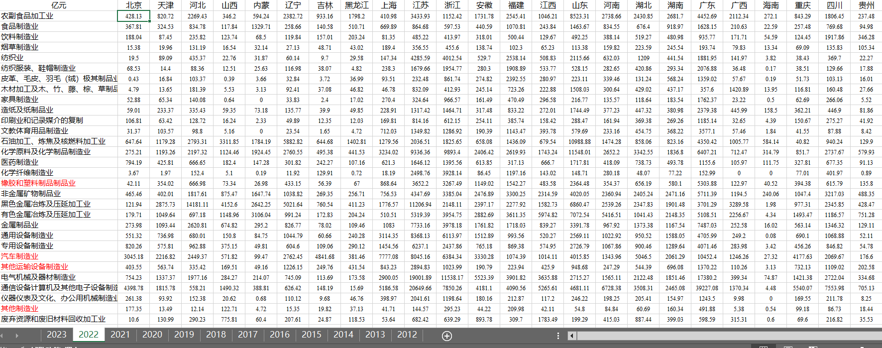 2012年-2023年制造业分行业分地区主营业务成本数据