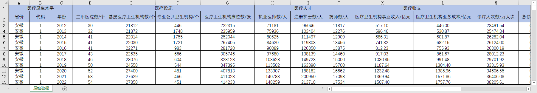 省份 代码 年份 三甲医院数/个 基层医疗卫生机构数/个 专业公共卫生机构/个 医疗卫生机构床位数/张 执业医师数/人 注册护士数/人 药师数/人 医疗卫生机构事业收入/亿元 医疗卫生机构业务成本/亿元 诊疗人次数/万人次 急诊病死率% 入院人数/万人 住院病死率% 人均卫生费用/元 城乡居民医疗保健支出占消费性支出