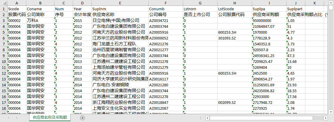 Suplpa[供应商采购额]-上市公司向每个供应商的采购金额。单位:元