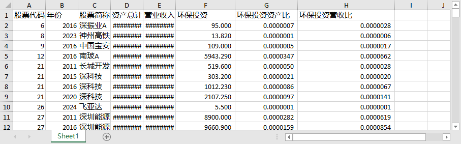 股票代码 年份 股票简称 资产总计 营业收入 环保投资 环保投资资产比 环保投资营收比