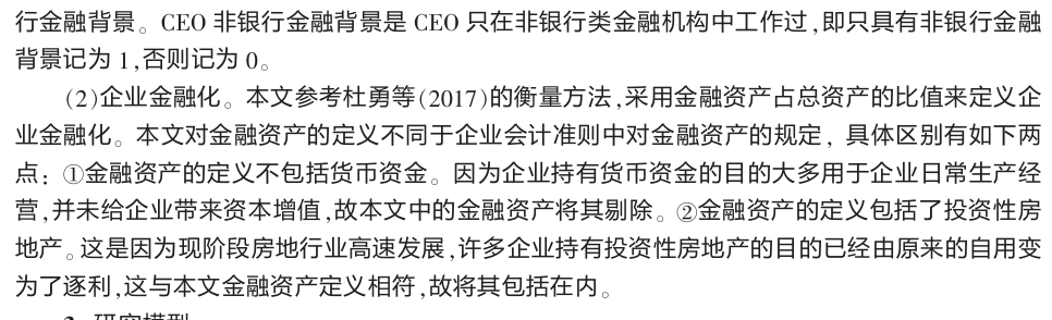 :参考《中国工业经济》杜勇(2019)老师的研究,采用金融资产占总资产的比值来定义企业金融化。本文对金融资产的定义不同于企业会计准则中对金融资产的规定,具体区别有如下两点:金融资产的定义不包括货币资金。因为企业持有货币资金的目的大多用于企业日常生产经营,并未给企业带来资本增值,故本文中的金融资产将其剔除。金融资产的定义包括了投资性房地产。这是因为现阶段房地行业高速发展,许多企业持有投资性房地产的目的已经由原来的自用变为了逐利,这与本文金融资产定义相符,故将其包括在内。