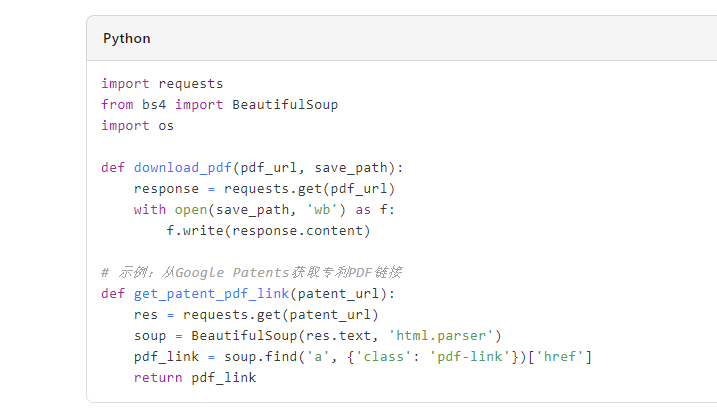 你可以使用Python编写脚本,结合 requests、BeautifulSoup 等库,从以下网站爬取企业专利信息并下载PDF: