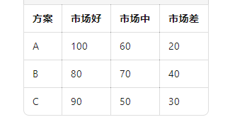 假设某企业有三个投资方案,在不同市场状态下的收益如下(单位:万元):