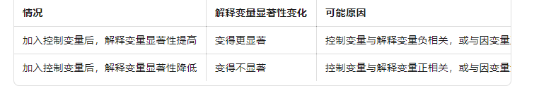 加入控制变量后,模型的拟合优度(如R²)提高,说明控制变量对模型有贡献。