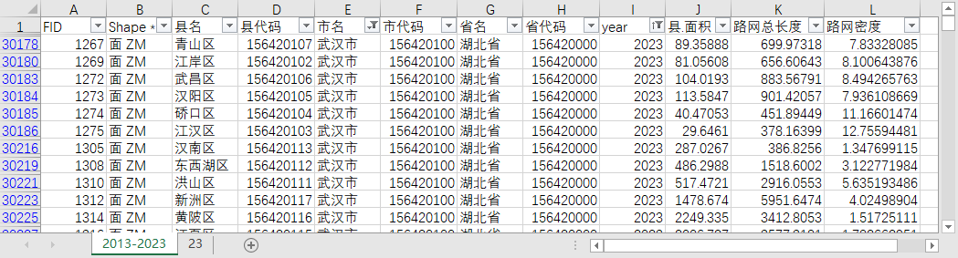 [绿圆]FID、Shape *、县名、县代码、市名、市代码、省名、省代码、年份、县.面积、路网总长度、路网密度。