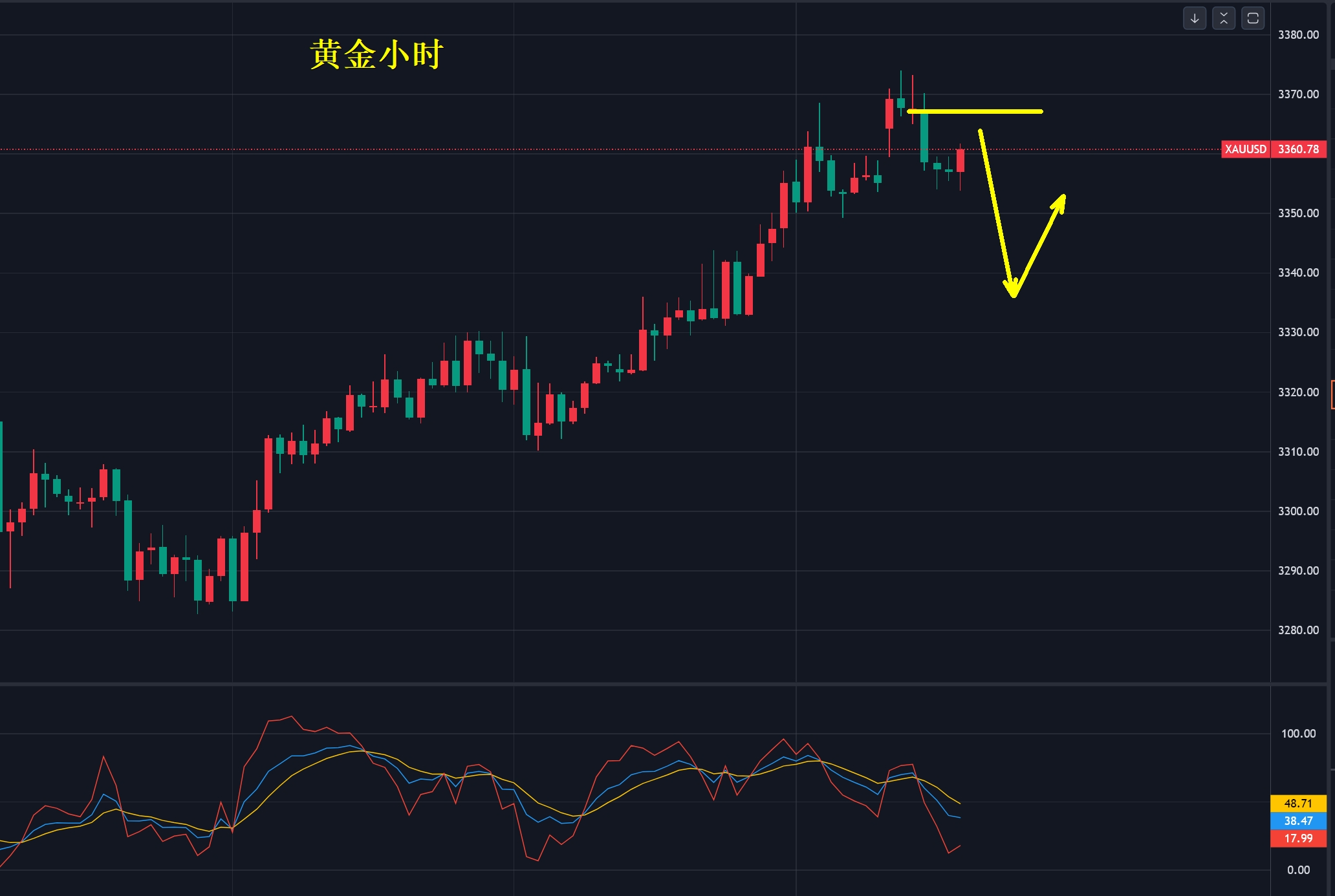 1小时,出现了跳空高开后回落破位,早上最高金价打到3375附近,紧接着回落破位了3359-60的位置,这个是早上的起涨点,破位后反弹确认要注意金价有回落的风险,上涨的强势一般不需要回踩,尤其是破位式的回补,这种破位后反弹诱多可能性较大,压力在3365附近。