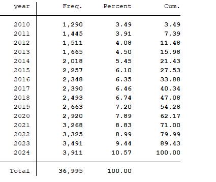 因为研发支出从2006年开始,需要连续5年的数据,所以最终计算结果区间为2010-2024年