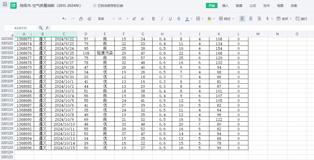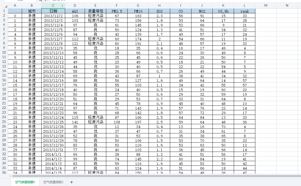包含指标:城市、日期、AQI、质量等级、PM2.5、PM10、SO2、CO、NO2、O3_8h、rank。