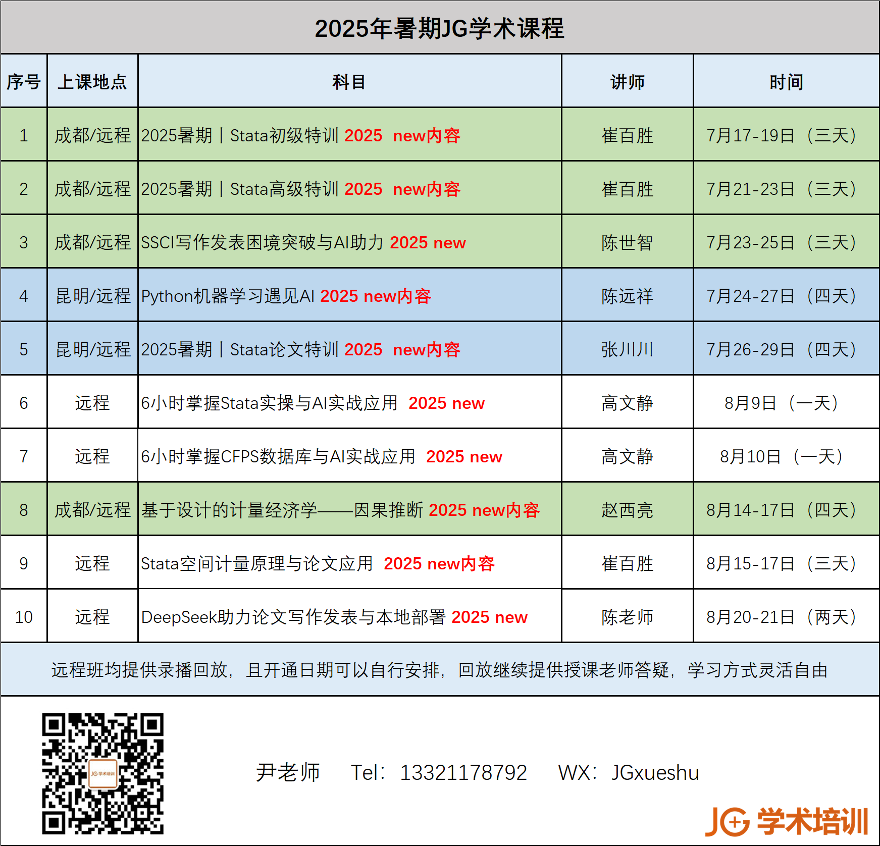 为了帮助研究者掌握这一广泛使用的因果推断技术,并进一步探索人工智能与机器学习在计量经济学中的前沿应用,经管之家学术培训特别推出了2025年Stata暑假班。课程内容不仅涵盖Stata高级计量分析与因果推断的核心方法,还包括异质性DID模型、断点回归与合成控制法的前沿专题,以及AI赋能的因果推断与数据分析技术。